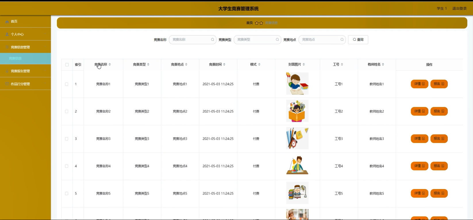 《基于springboot的大学生竞赛管理系统》该项目含有源码、论文等资料、配套开发软件、软件安装教程、项目发布教程等。系统功能完整,适合作为毕业设计、课程设计、数据库大作业学习使用。 项目功能介绍 学生端功能有:竞赛信息查看、竞赛报名、作品打分查看、报名交费、个人信息管理; 管理端功能有:教师管理、学生管理、竞赛信息管理、竞赛报名审核、班级信息管理等; 教师端功能有:竞赛信息管理、竞赛报名审核、作品打分、个人中心。 更多功能请看运行截图! 学习文档