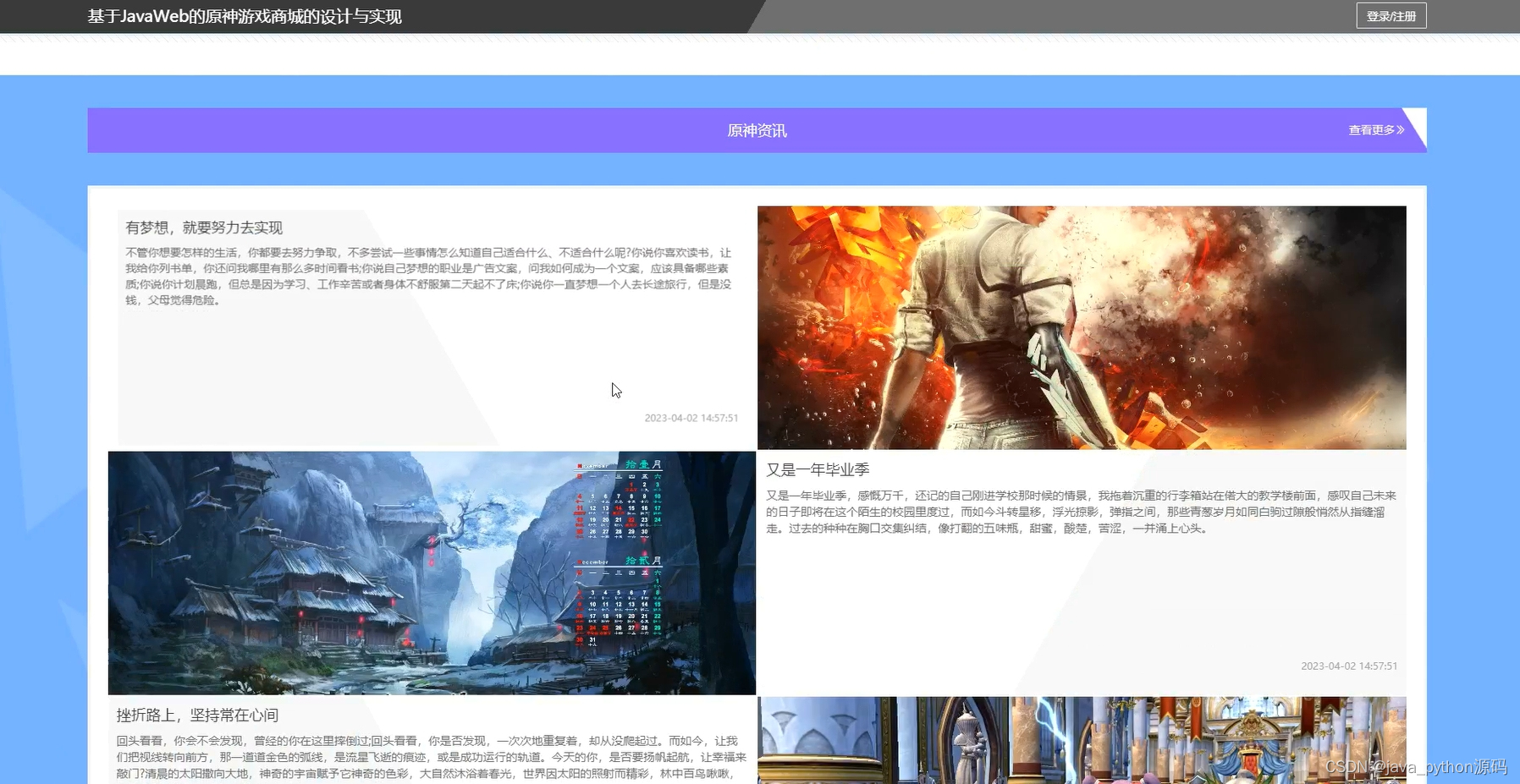 随着游戏行业的快速发展,游戏周边商品市场潜力巨大。原神作为一款备受欢迎的游戏,其周边商品也备受关注。然而,传统的游戏周边商品销售方式存在诸多问题,如渠道受限、价格较高、品质难以保证等。因此,开发一个基于Spring Boot的原神游戏商城,旨在为玩家提供一个便捷、可靠、优质的游戏周边商品购买平台,满足玩家对于高品质周边商品的需求。