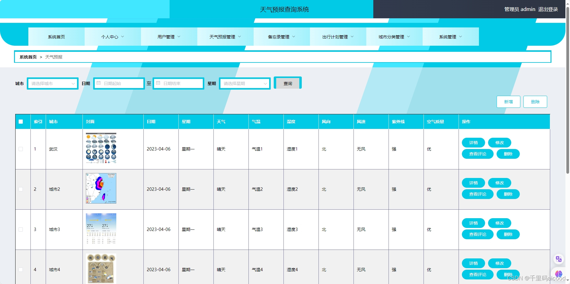 随着社会的发展和人们生活水平的提高,天气预报已经成为人们日常生活和工作中不可或缺的一部分。传统的天气预报方式通常是通过电视、广播等媒体进行发布,用户需要手动查找并记住各个地区的天气信息,不够直观和便捷。因此,基于Spring Boot的天气预报管理系统应运而生,旨在解决传统天气预报方式的不足,提供更加准确、便捷的天气信息服务。