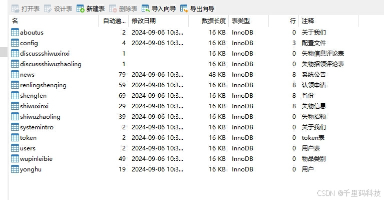 六、数据库表截图(示范表注释):