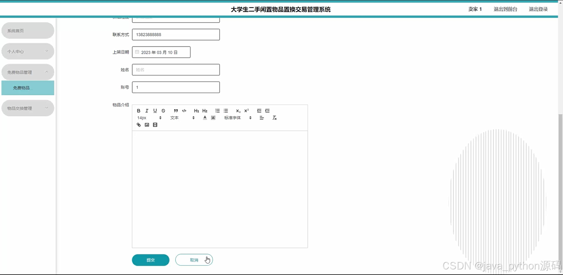 - 大学校园内每天都会产生大量的二手物品交易需求,包括书籍、电子产品、生活用品等。这些物品往往还具有使用价值,但由于信息不对称、交易方式不便等问题,导致交易效率低下。因此,开发一个适合大学生的二手闲置物品置换交易管理系统具有重要的现实意义。