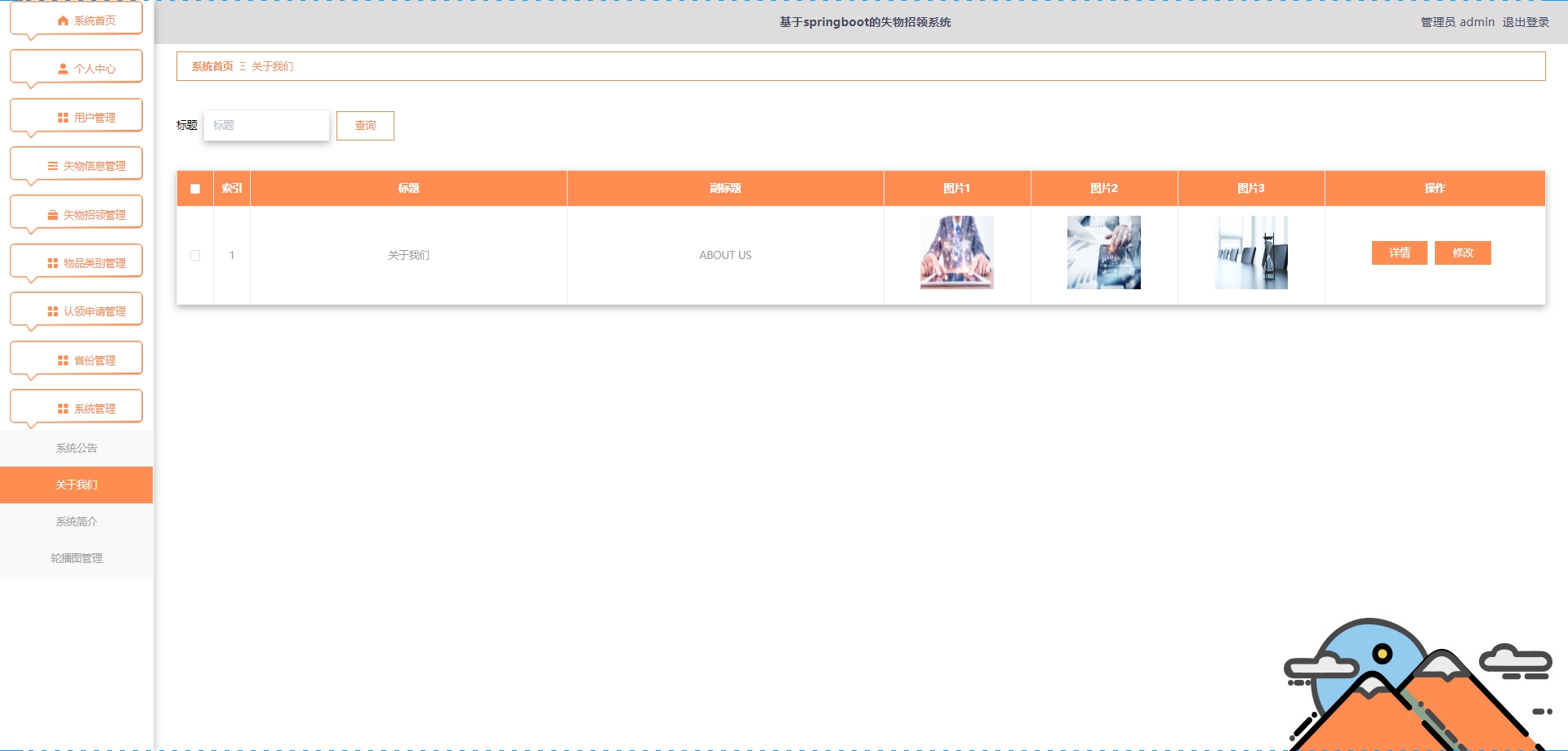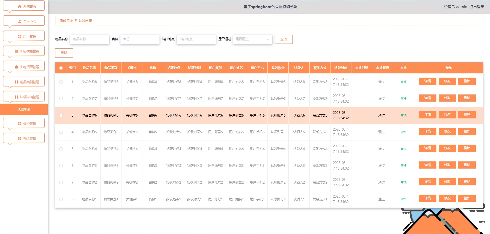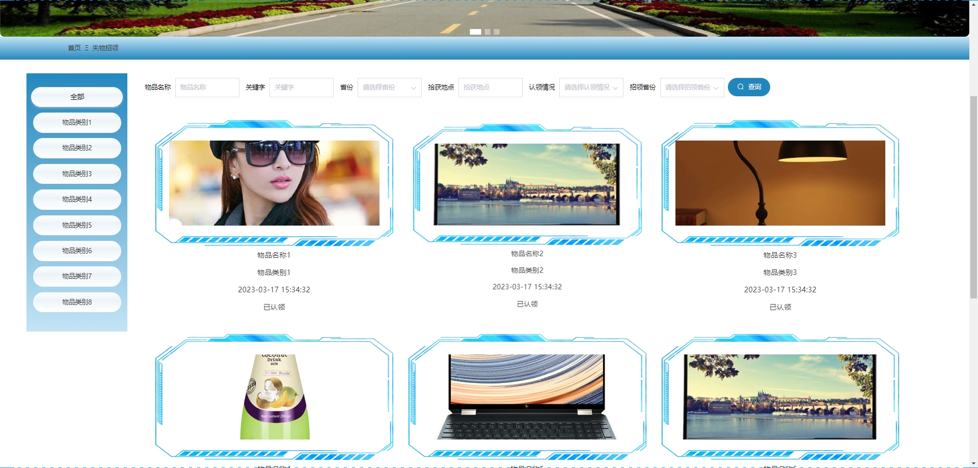 展示所有招领信息,支持分类筛选和关键词搜索。前端通过 Axios 调用后端 API 获取数据并渲染。