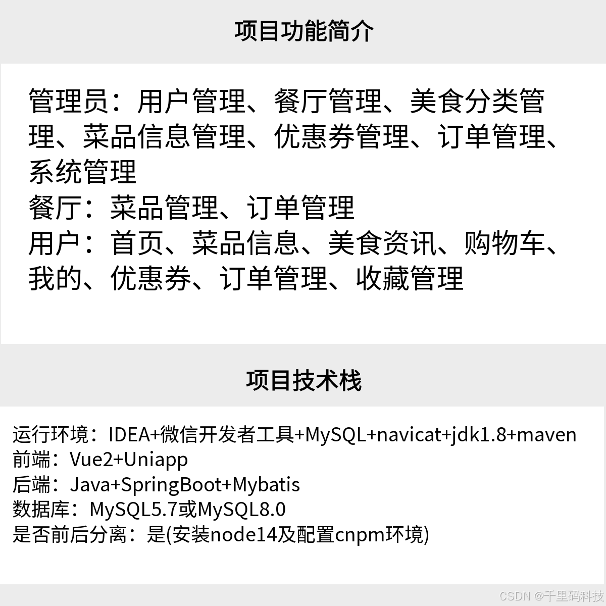 Spring Boot 和 Vue.js 作为当前主流技术栈,为餐厅点餐外卖小程序提供了高效、模块化的开发方案。