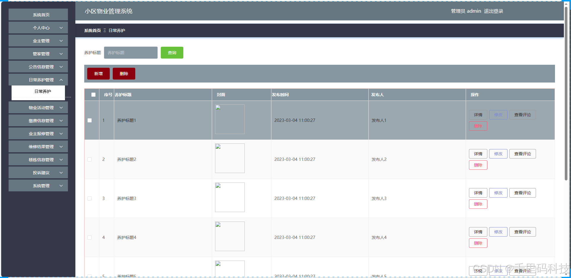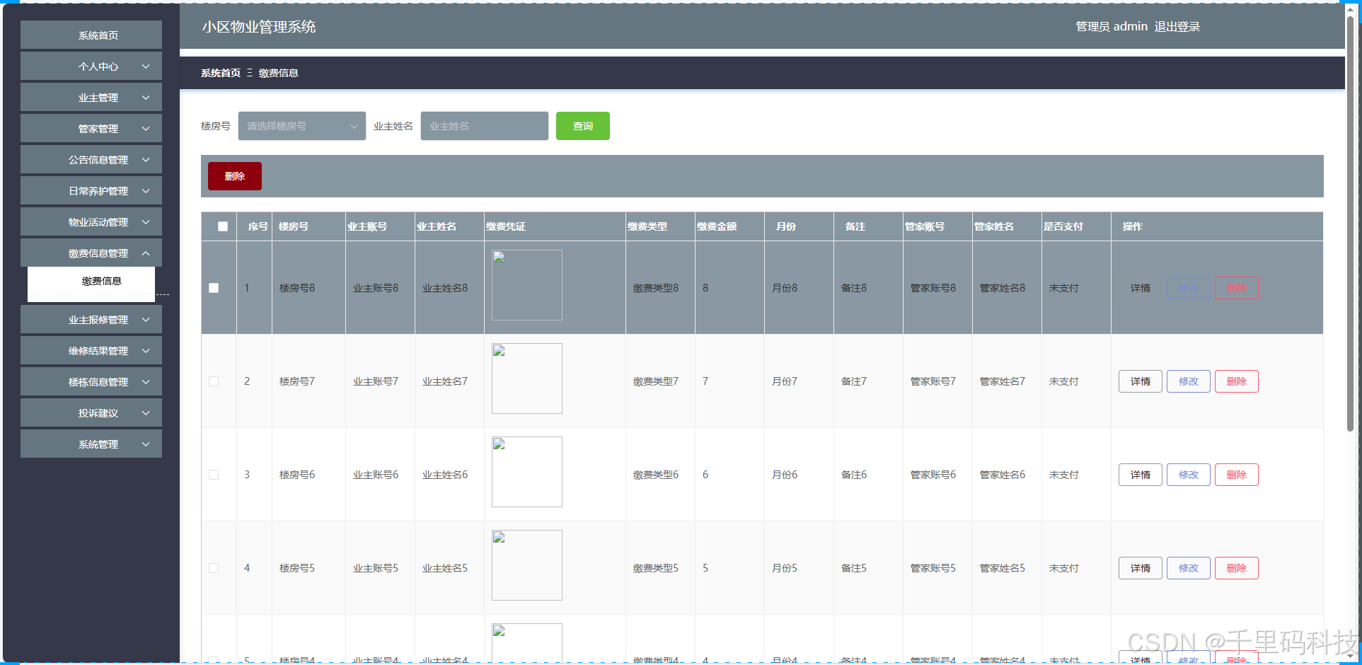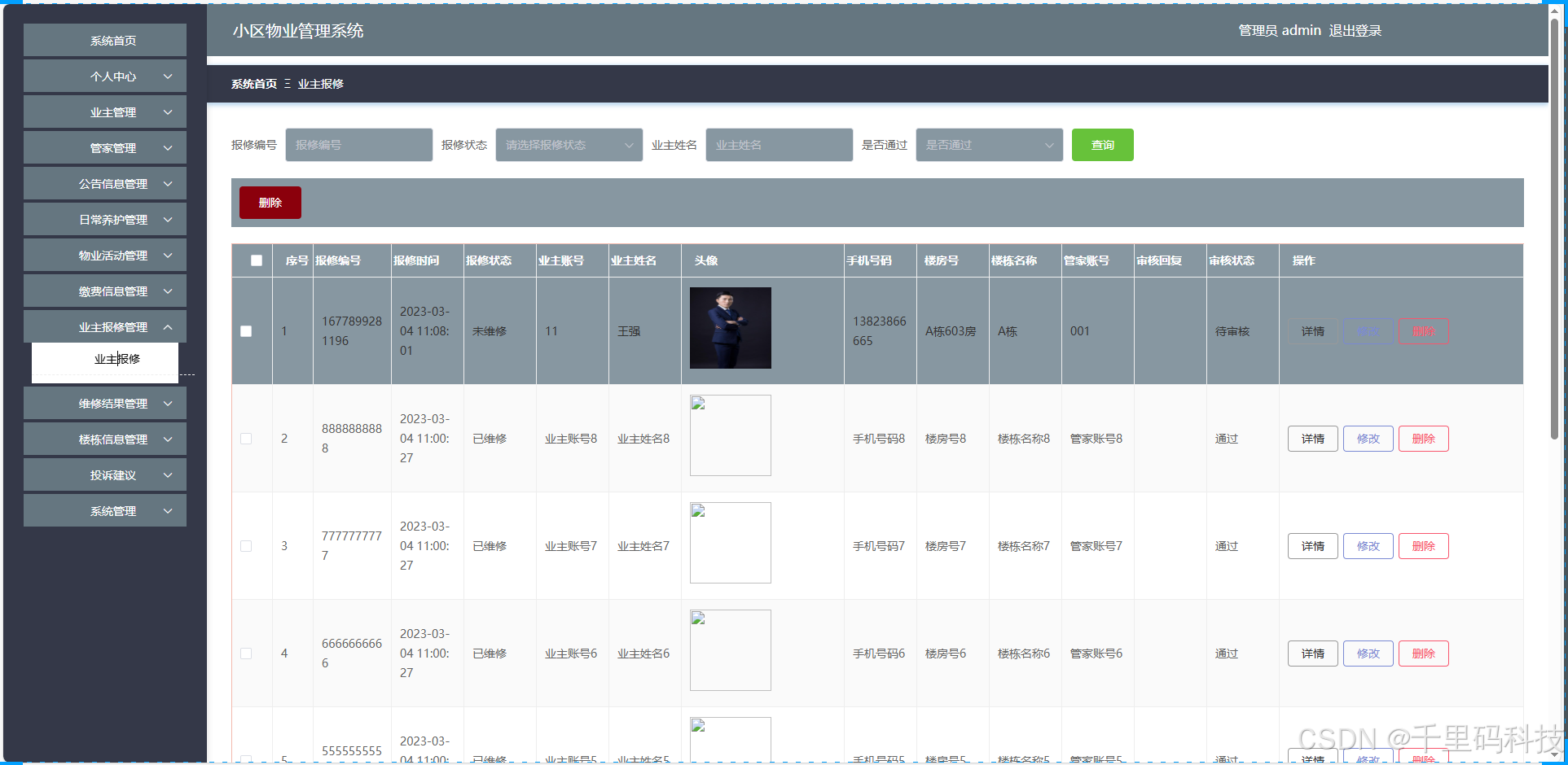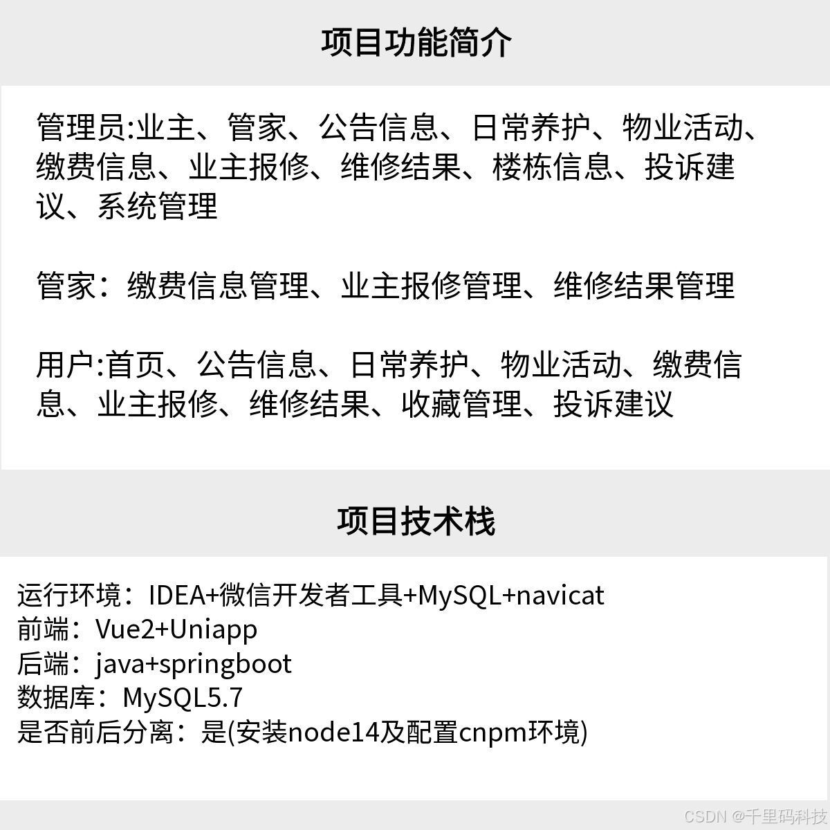 - Spring Boot:作为 Java 领域的快速开发框架,简化了后端服务的配置和部署,内置 Tomcat 等服务器,支持 RESTful API 开发,适合构建物业管理系统的核心业务逻辑(如住户管理、缴费、报修等)。