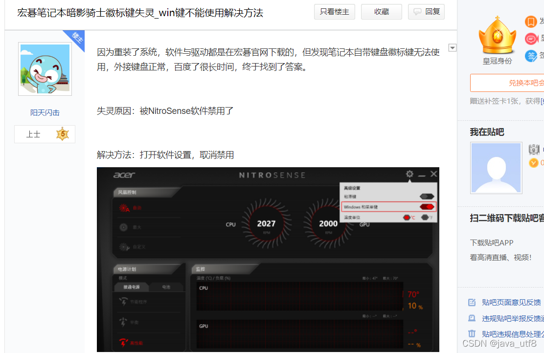 本文记录了一位用户在acer Nitro AN515-45笔记本上遇到Windows键失灵的问题及解决过程。尝试了fn+win解锁、修改注册表、键值映射等方法无效,最终在acer官方贴吧找到解决方案,通过下载特定软件修复了问题。
