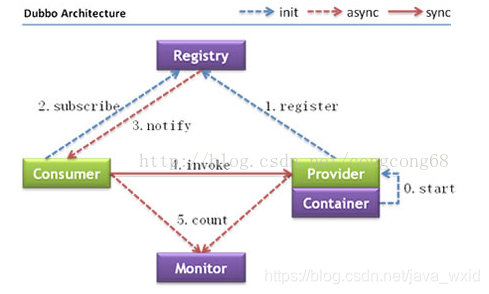 主要有五个角色/核心组件,分为是Container(容器)、Provider(服务的提供方)、Registry(注册中心)、Consumer(服务的消费方)、Monitor(监控中心)。