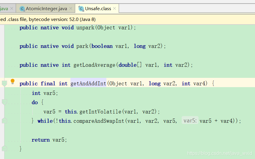 可以看到方法体内又通过调用Unsafe类中的getAndAddInt()方法