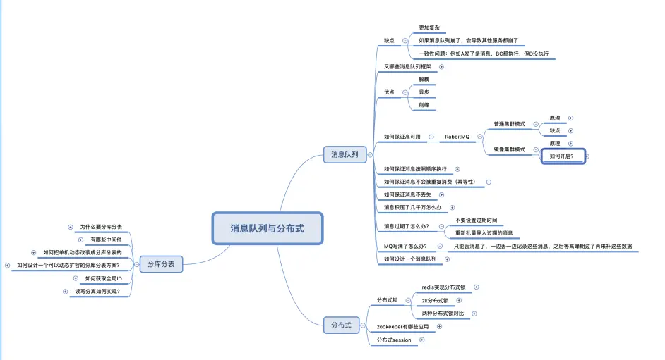 面试的第一和第二面一般会根据你的实际项目情况来进行提问,我的项目中涉及到了消息队列,所以在面试前我也特意准备了消息队列这一部分。消息队列主要涉及到的点包括消息队列、分布式锁、分库分表等,这些内容我也特意整理了一份脑图,根据图上的要点来进行复习基本上是没什么问题的。
