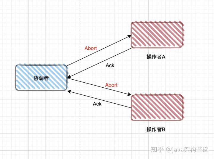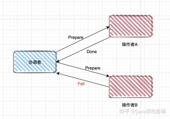 假如在第一阶段有一个参与者返回失败,那么协调者就会向所有参与者发送回滚事务的请求,即分布式事务执行失败。如下图: