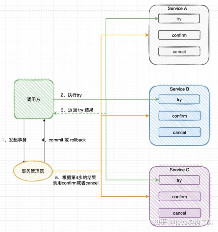 图中就是一个典型的分布式系统的原子性操作,涉及A、B、C三个服务的执行。如果有一个服务 try 出问题,整个事务管理器就执行calcel,如果三个try都成功,才执行confirm做正式提交。