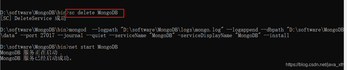 此时的解决办法是先删除服务,然后以mongodb命令方法重新注册。