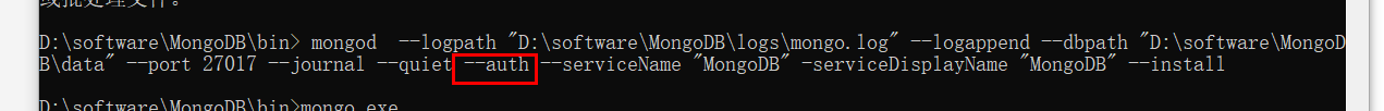 mongod --logpath "D:\software\MongoDB\logs\mongo.log" --logappend --dbpath "D:\software\MongoDB\data" --port 27017 --journal --quiet --serviceName "MongoDB" -serviceDisplayName "MongoDB" --install