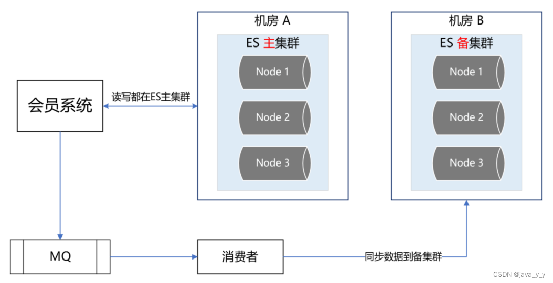 我们有两个机房,分别是机房 A 和机房 B。我们把 ES 主集群部署在机房 A,把 ES 备集群部署在机房 B。会员系统的读写都在 ES 主集群,通过 MQ 将数据同步到 ES