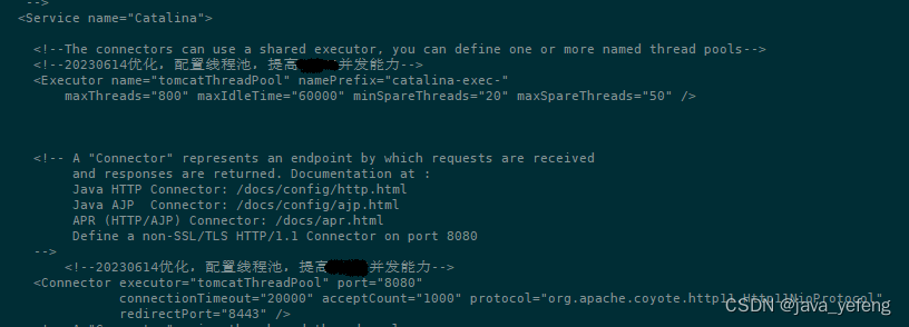 排查问题过程中发现server.xml没有配置线程池,连接器配置的是HTTP1.1,修改配置,见下图: