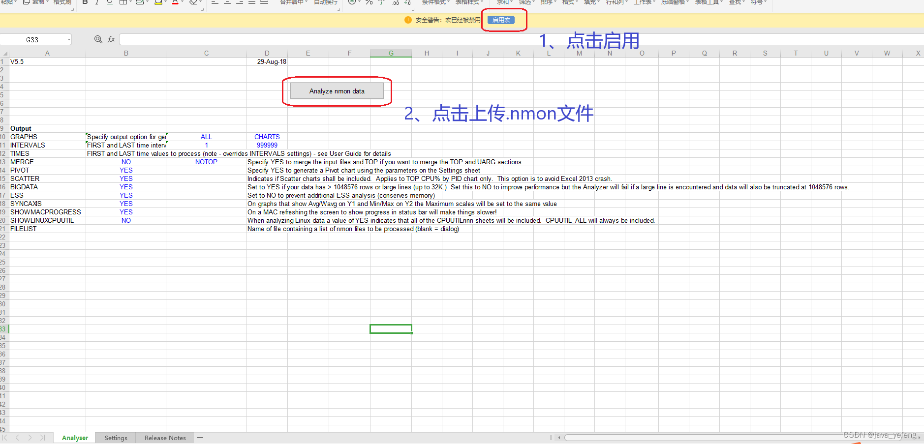 生成.nmon文件后,需要用到nmon analyser v55.xlsm分析.nmon文件,打开使用时注意要启用宏,然后选择.nmon文件最后转化成可以被人读懂的文件。