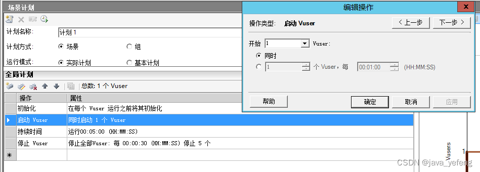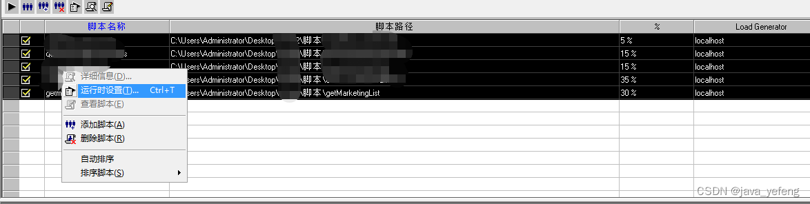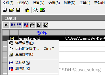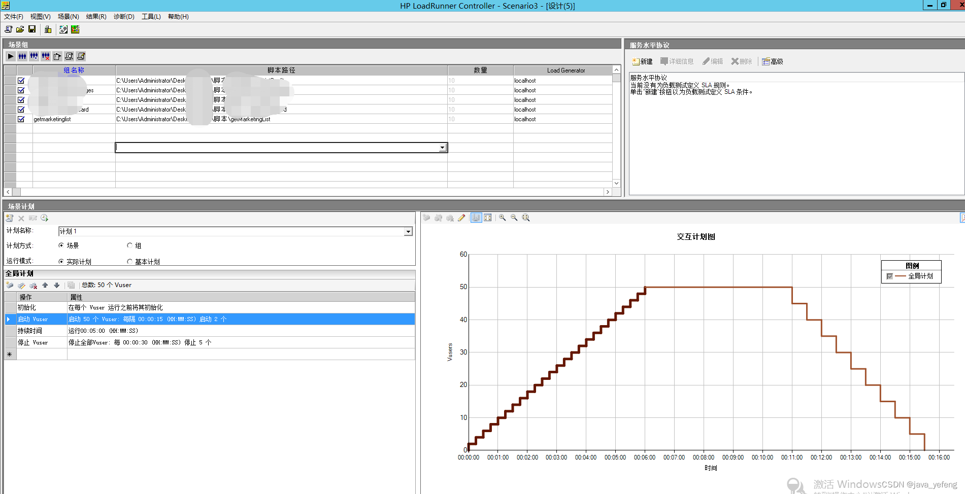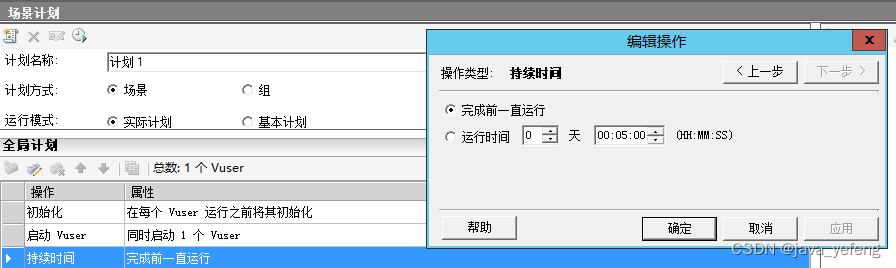 全局计划,设置并发用户数、运行时间等略去,参考基准测试如何配置。最后把场景保存到制定位置。