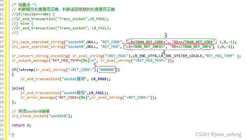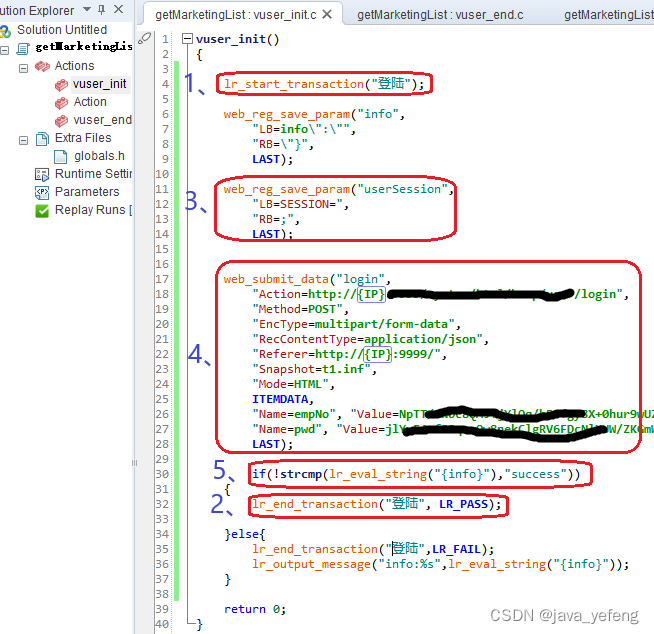 上图标识5含有strcmp函数、lr_eval_string()函数:strcmp函数作用是字符串比较,相等则返回0,strcmp(a,b)==0等同于!strcmp(a,b),lr_eval_string()函数作用是返回脚本中的一个参数当前的值;