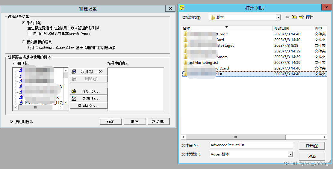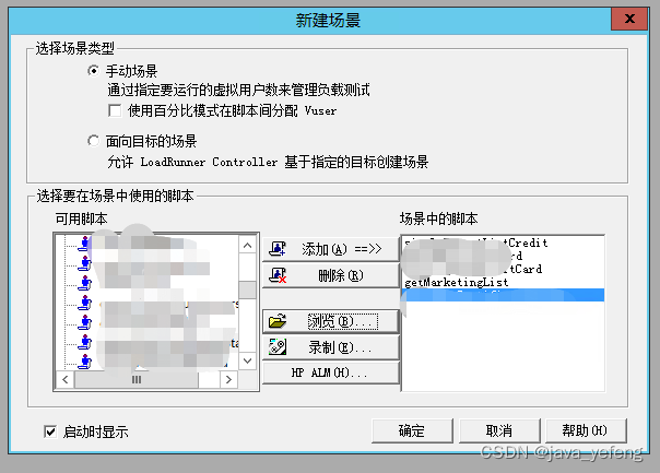 打开HP LoadRunner Controller,左上角文件-》新建,点击“浏览”,逐步把混合测试需要的交易加到场景中的脚本区域,如下图: