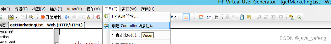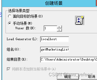 打开HP Virtual User Generator,还是针对getMarketingList交易,导航栏选择工具-》创建Controller场景,设置场景保存目录,如下图。