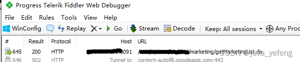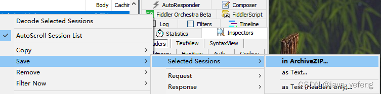 打开Fiddle,找到对应的交易,然后右键选择Save->Selected Sessions->in ArchiveZIP...,保存在录制脚本的文件夹中,取名getMarketingList,得到getMarketingList.saz。