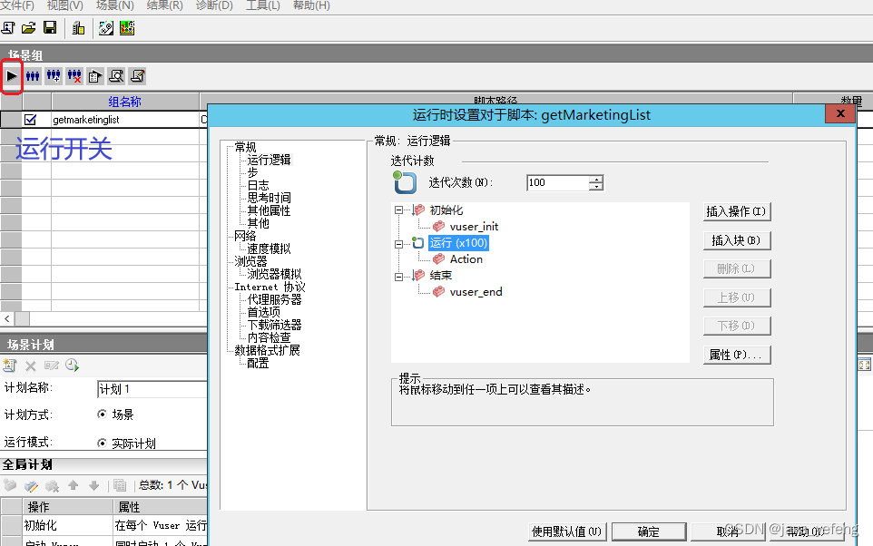设置迭代次数为1,选中带测交易,右键,然后选择运行时设置,设置迭代次数为100,最好点击运行开关,如下图:
