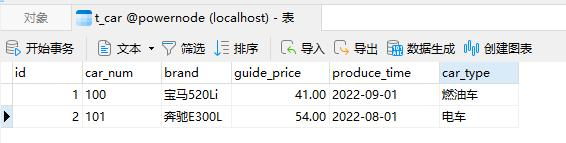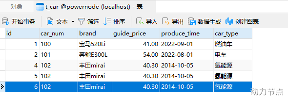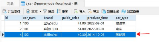 以上程序运行后,看到数据库表t_car中又新增一条数据,如下(成功了):