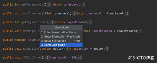 禅模式能消除可能的干扰并帮助开发者完全专注于代码上。本质上,这种新模式结合了免打扰模式和全屏模式,因此不必每次想要进入或退出它们时都启用或禁用这两种模式。要启用禅模式,请跳转至 View | Appearance | Enter Zen Mode ,或从“快速切换方案”弹出窗口中进行选择(Ctrl+` | View mode | Enter Zen Mode)。