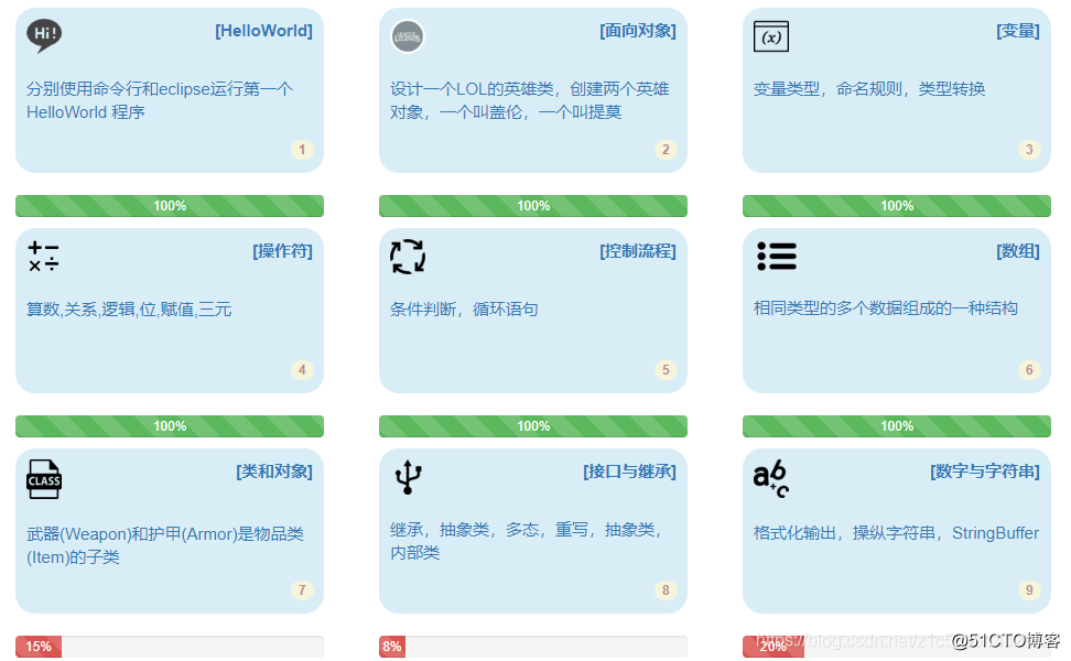 这个网站是2015年建成的,五年多时间了,完全由站长一人编写,从最初的很少的知识点,到现在的几乎所有知识都有,以有趣和好理解的方式展示Java和Web的内容,设计一些略有挑战的练习,创造一些便于理解和消化知识点的方式,站长每日慢慢做,期望尽己所能涵盖越来越多和 java 相关的内容吧.现在总共 7 个阶段,69个模块,共 1476 个知识页面。
