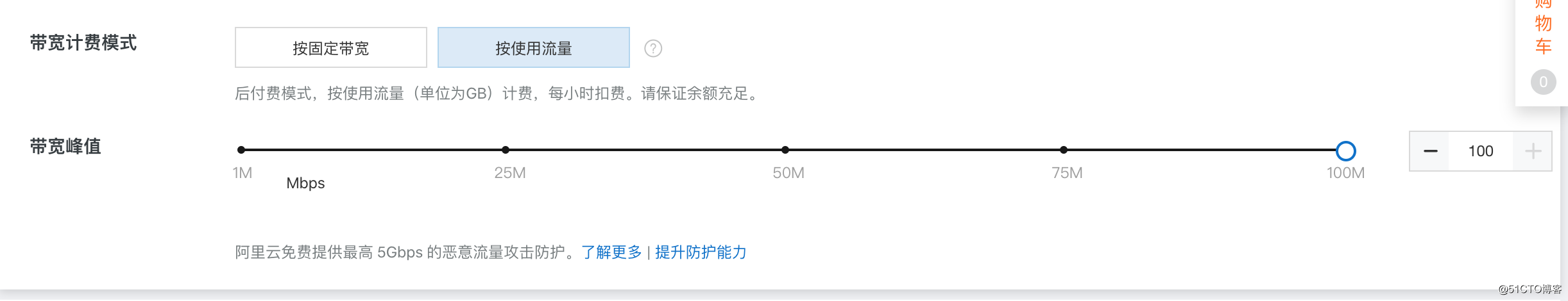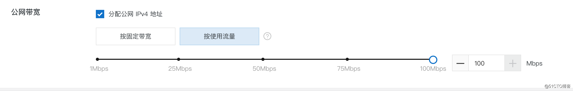 带宽选择按使用流量 100MB,这样选择可以增加上传和下载速度,服务器下载对应软件时,可以增加速度,而在平时低峰时期也不占用额外带宽。