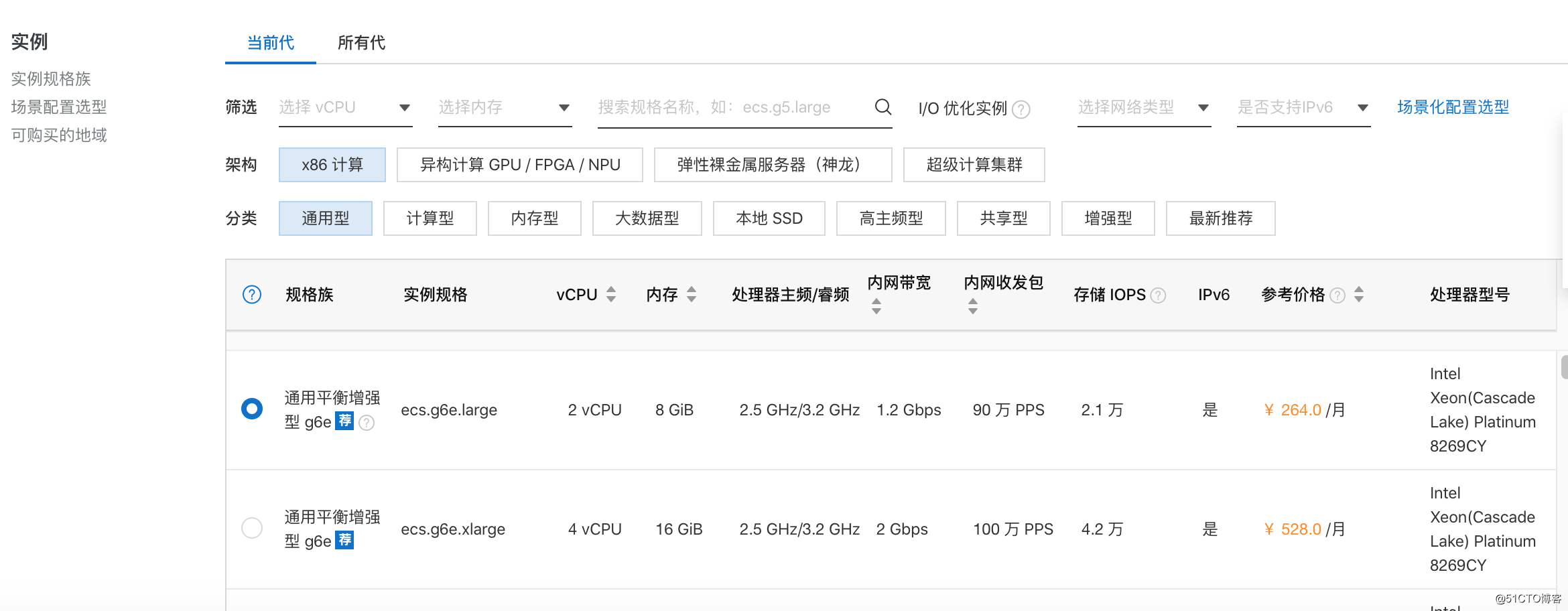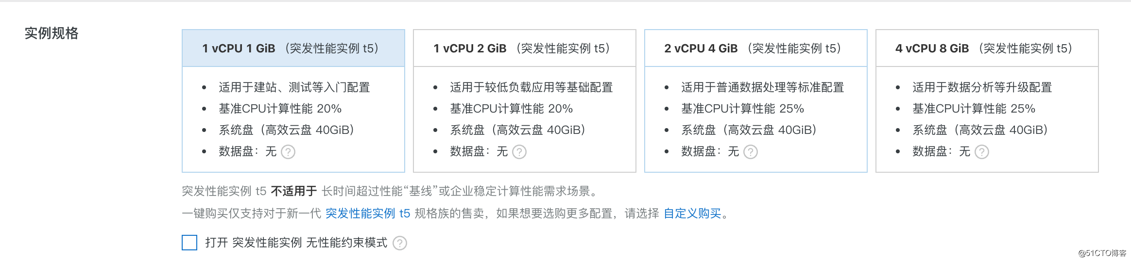 所有的实例都是 t5,不同的是 CPU 和 内存配置不同,如果你的站点访问量不大,选择 1 核 1G 就可以了,如果对内存和计算能力有要求,那么根据自己的场景选择升级对应的 CPU 和内存既可。