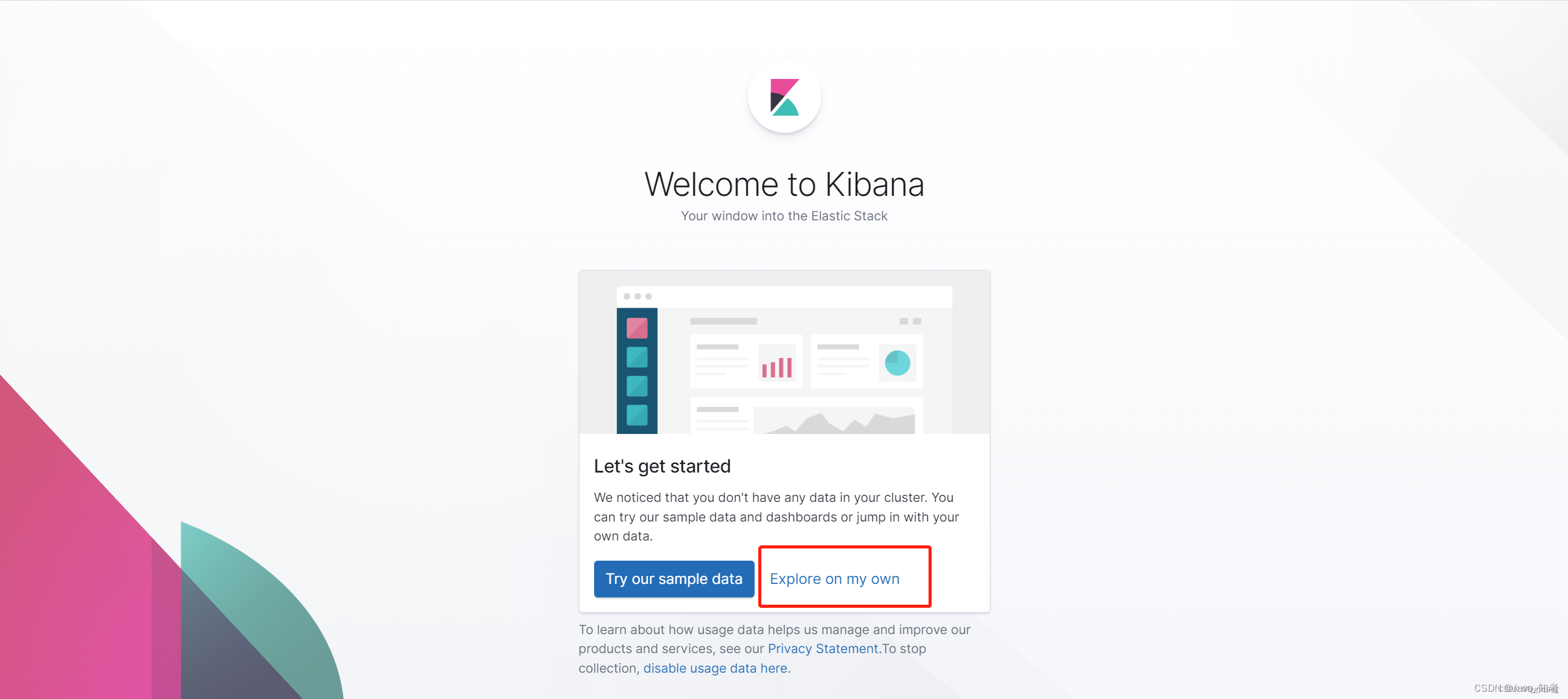 配置好以后在bin目录下启动kibana.bat文件,启动完成后页面访问http://localhost:5601/看到以下页面就代表安装成功了