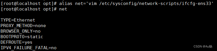 例如:alias net=‘vim /etc/sysconfig/network-scripts/ifcfg-ens33’,此时用net即可代替,并修改网卡配置信息