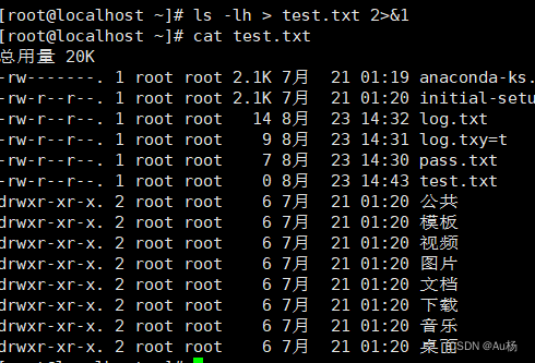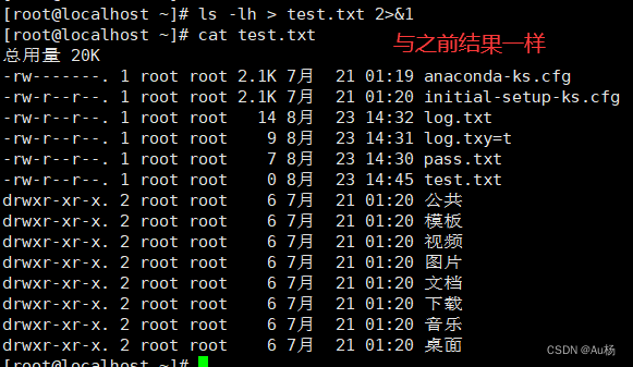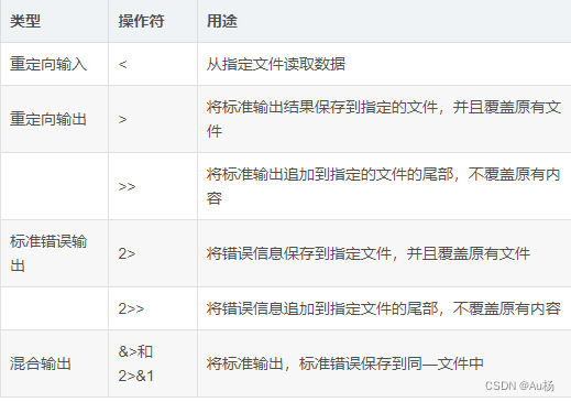 eg3:ls -lh > log.txt 2>&1 等同于 ls -lh &> log.txt > (将标准输出结果保存到指定的文件) 2>&1(将标准错误输出重定向到标准输出) &>(将标准输出、标准错误输出保存到同一文件)