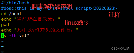 脚本申明(解释器) :若第一行为“!/bin/bash",表示此行以下的代码语句是通过/bin/bash程序来解释执行,#!/bin/bash为默认解释器。还有其它类型的解释器,比如# !/usr/bin/python. #! /usr/bin/expect.