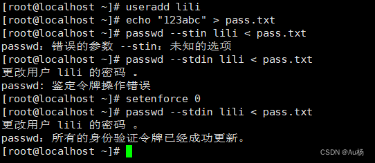 eg1:将123456重定向输出到pass.txt文件中,然后将pass.txt的内容重定向输入给用户lili的密码,从pass.txt 文件中取密码,需要注意SELinux 会影响此命令执行,若执行失败可尝试关闭SELinux(setenforce 0)。