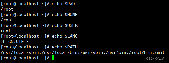 变量USER表示用户名称,HOME表示用户的宿主目录,LANG表示语言和字符集,PWD表示当前所在的工作目录,变量PATH表示可执行程序的默认搜索路径