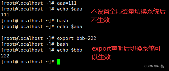 默认情况下,新定义的变量只在当前的Shell环境中有效,因此称为局部变量。当进入子程序或新的子Shell环境时局部变量将无法再使用。