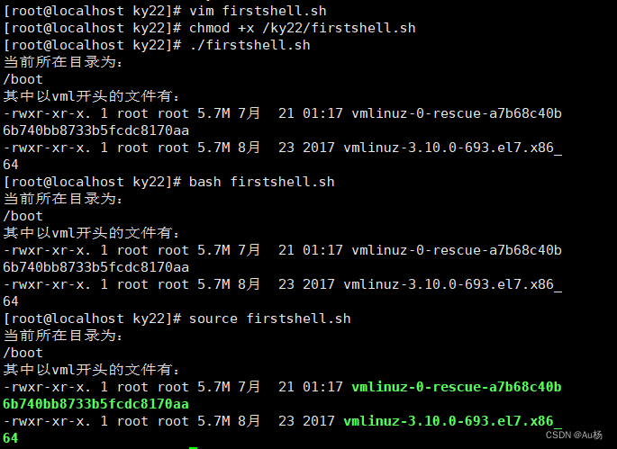 -rwxr-xr-x. 1 root root 5.7M 8月 23 2017 vmlinuz-3.10.0-693.el7.x86_64#法三:source 脚本路径执行shell脚本