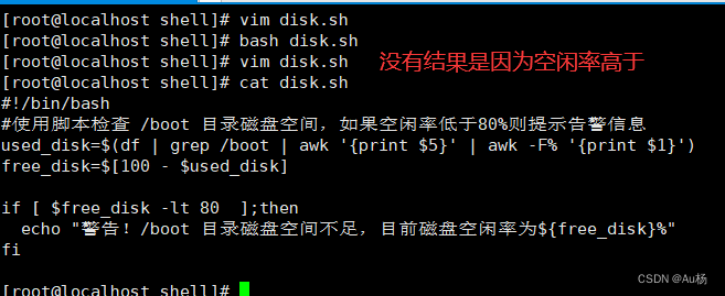 使用脚本检查 /boot 目录磁盘空间,如果空闲率低于80%则提示告警信息