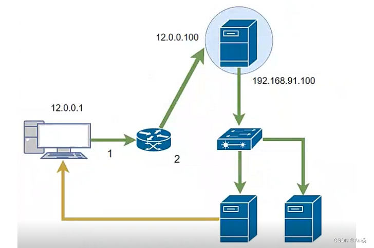 - NAT(地址转换)调度器作为所有节点服务器的网关,既作为客户端的访问入口,也作节点服务器响应的访问出口,也就意味着调度器将成为整个集群系统的瓶颈。 由于在转发过程中做了地址转发,对于节点服务器的安全性比其他模式较好。 调度器至少有两个网卡,一个承载VIP用于接收客户端的请求,另一个用于使用私有IP在同一个局域网中连接节点服务器。