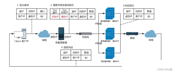 RealServer响应给客户端的IP头部是根据隧道内层的IP头分析得到的,源IP是VIP,目标IP是CIP