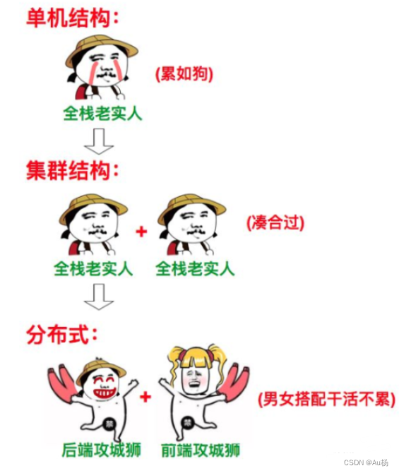 - 分布式:一个业务被拆成多个子业务,或者本身就是不同的业务,部署在多台服务器上。分布式中,每一台服务器实现的功能是有差别的,数据和代码也是不一样的,分布式每台服务器功能加起来,才是完整的业务。