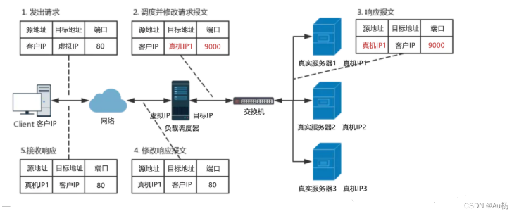 请求报文要经由Director,但响应不经由Director,响应由RealServer自己完成