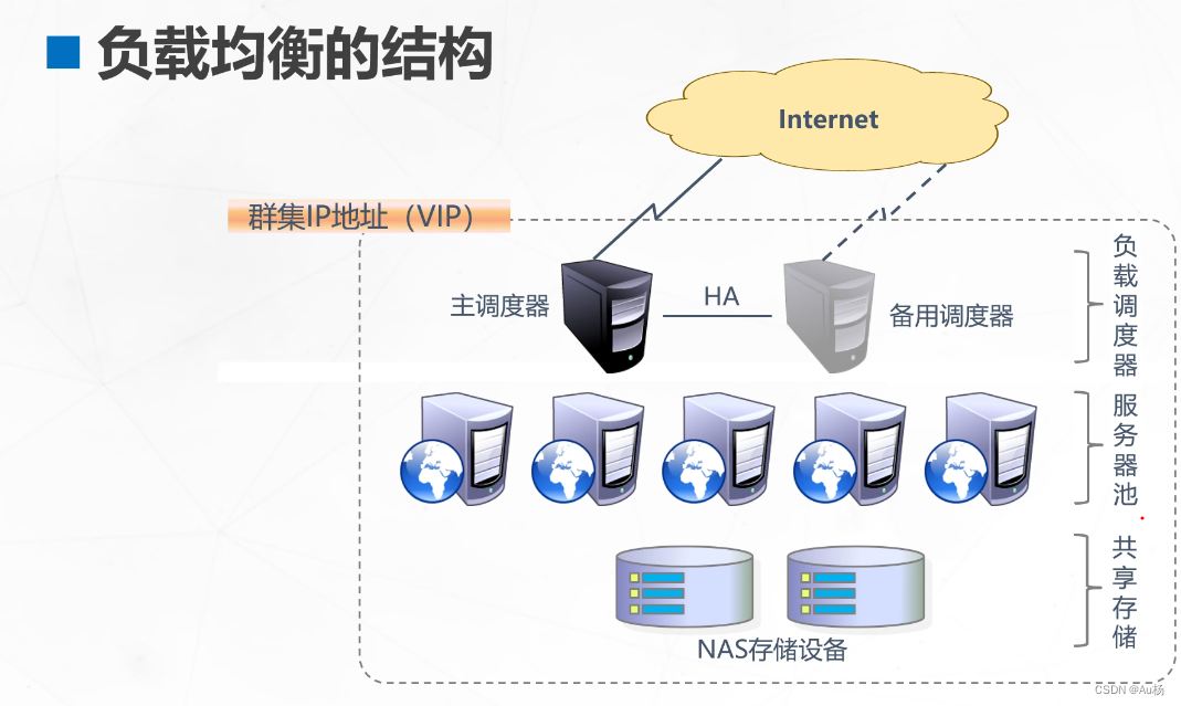 - 第一层,负载调度器。通过VIP接收用户的请求,再通过调度算法确定要转发的节点服务器。