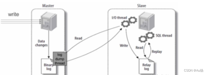主从复制的工作开始,主节点会开启二进制日志,从节点会开启中继日志,相关的数据更新会写入主节点二进制日志当中;