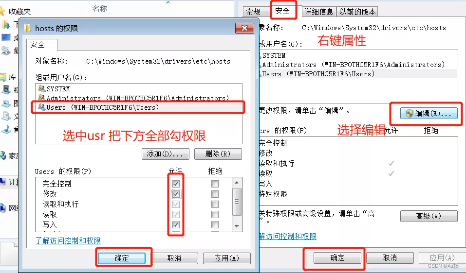 右击hosts文件,属性–>安全–>编辑–>组或用户名中的(Users)–>选择允许权限–>确定,图示在下面