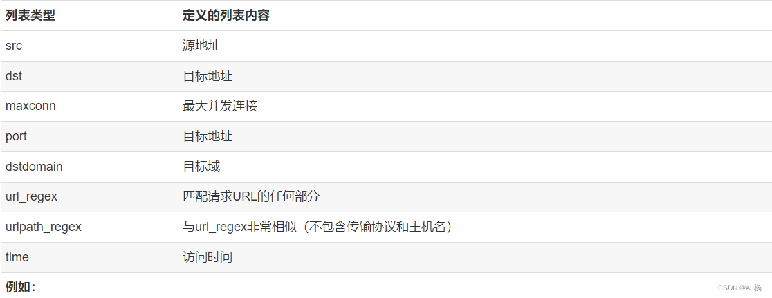 acl BURL url_regex -i ^rtsp:// ^emule:// #以 rtsp://、emule:// 开头的 URL,-i表示忽略大小写