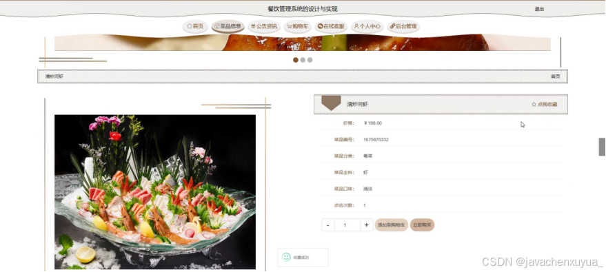 用户点击菜品信息;在菜品信息页面的搜索栏输入菜品名称、菜品分类、菜品口味,进行查询,还可以查看菜品编号、菜品名称、菜品分类、菜品图片、菜品主料、菜品口味、价格等信息,如有需要可以添加到购物车、立即购买、收藏等操作;如图5-4所示。