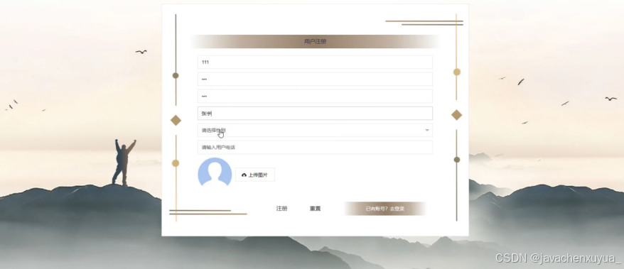 点击用户注册,用户通过注册页面填写用户账号、密码、确认密码、用户姓名、性别、用户电话、头像等信息,并点击注册操作,如图5-2所示。