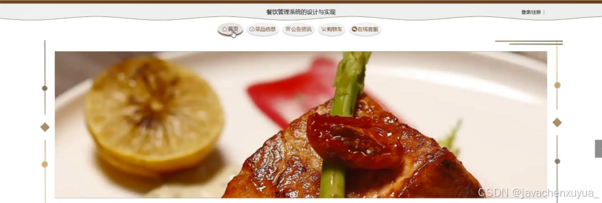 当游客打开系统的网址后,首先看到的就是首页界面。在这里,游客能够看到餐饮管理系统的导航条显示首页、菜品信息、 公告资讯、购物车、在线客服等。系统首页界面如图5-1所示: